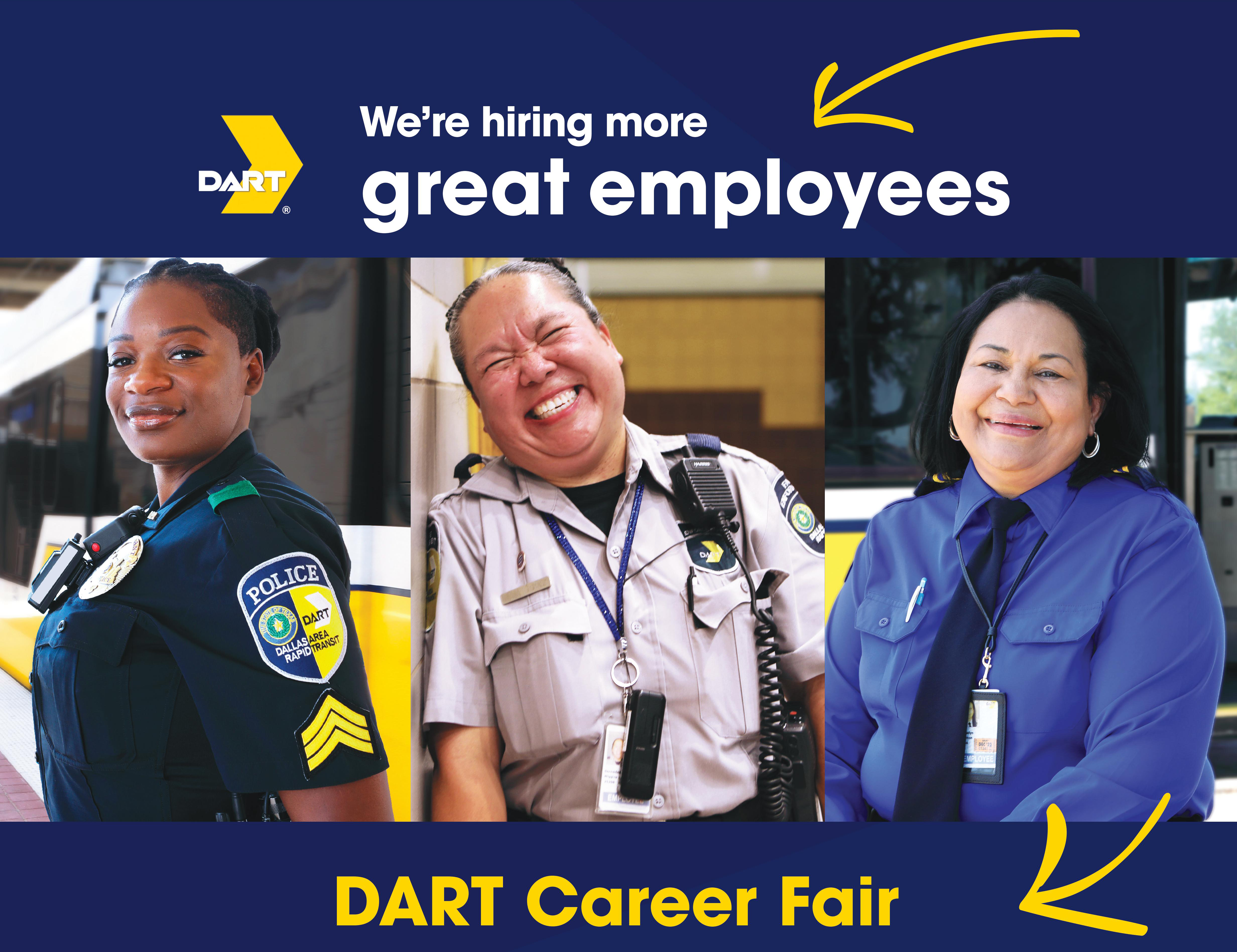 All recruiting open house events will take place from 10 a.m. to 2 p.m. at DART Headquarters in the second-floor atrium. Attendees should check in at either the parking garage or first-floor security desk, and staff will escort attendees to the job fair.
